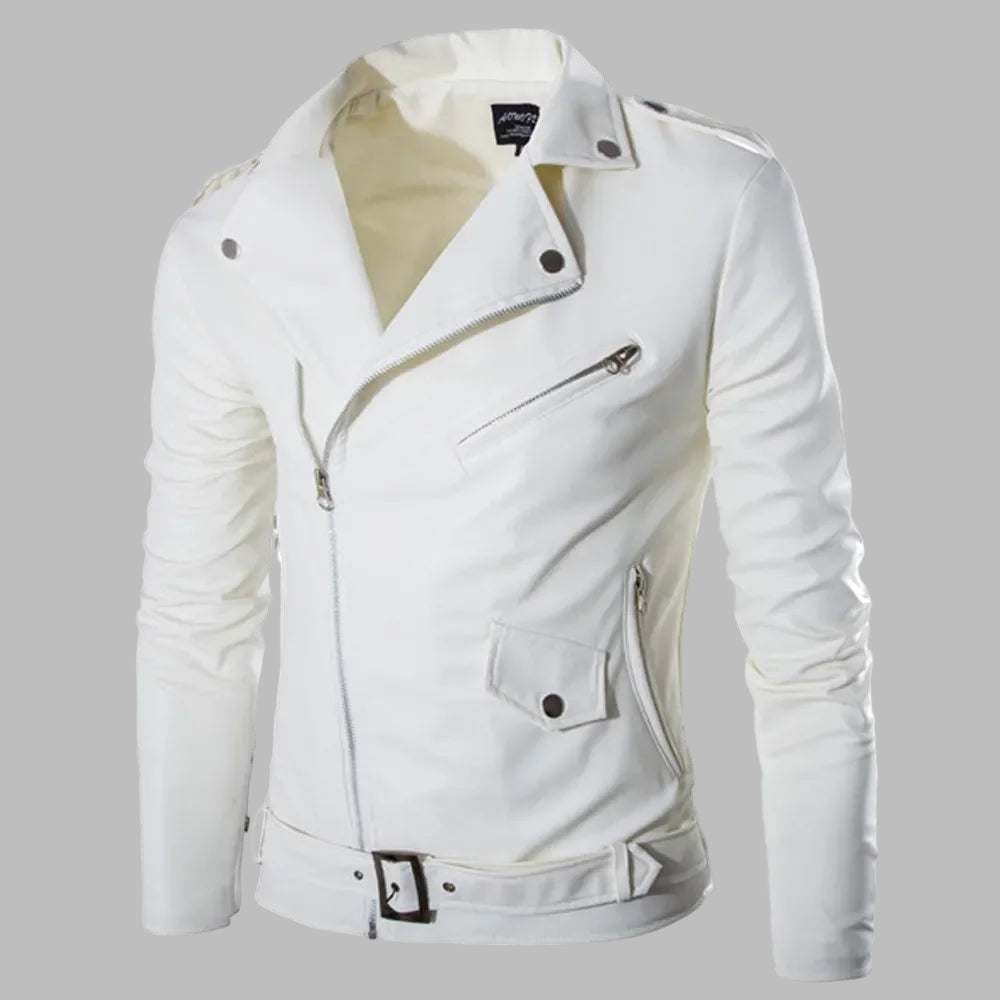 Blouson en Cuir Blanc Homme Motard avec Ceinture