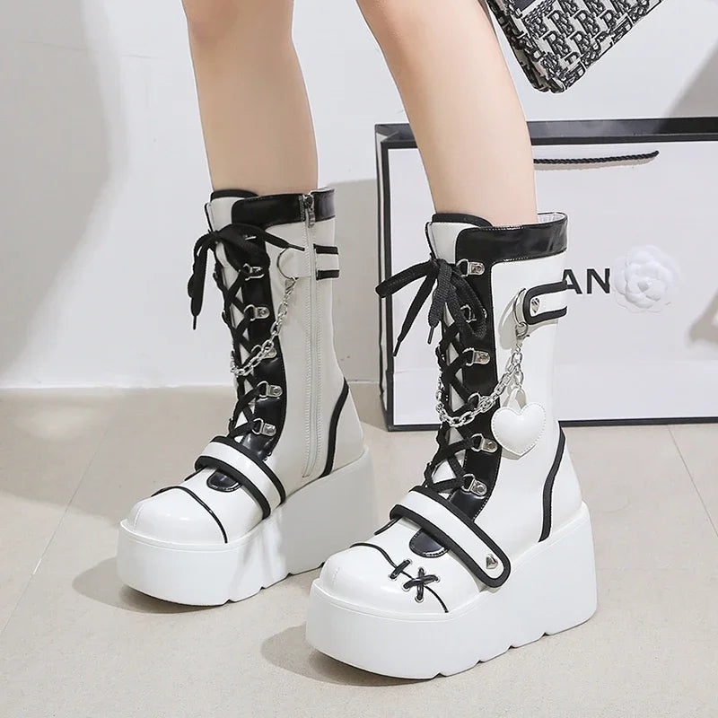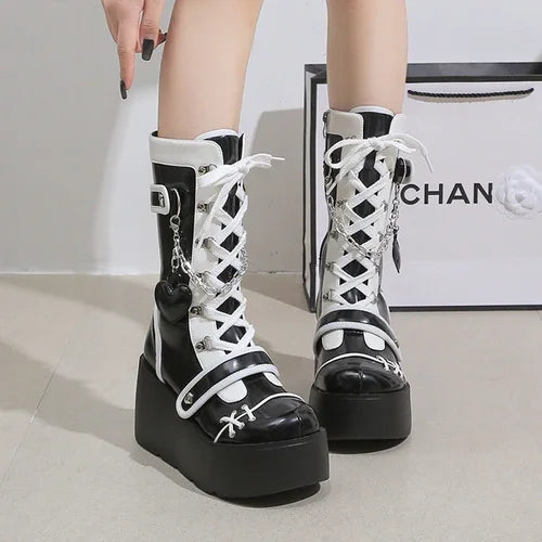 Bottes gothiques noir et blanc à plateforme avec lacets