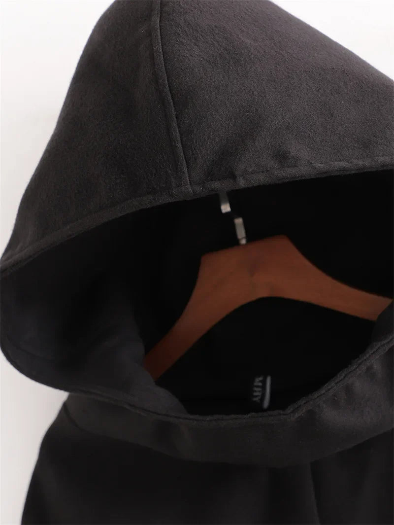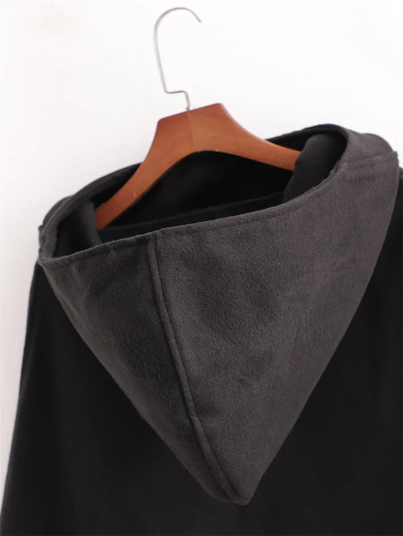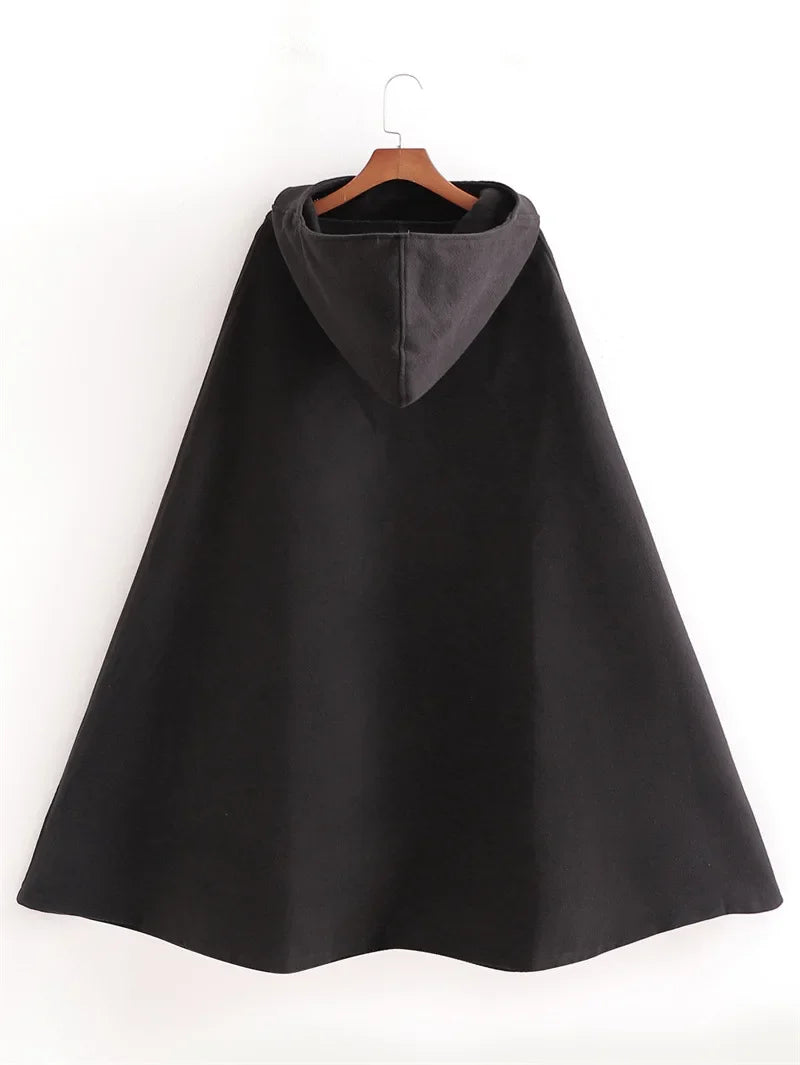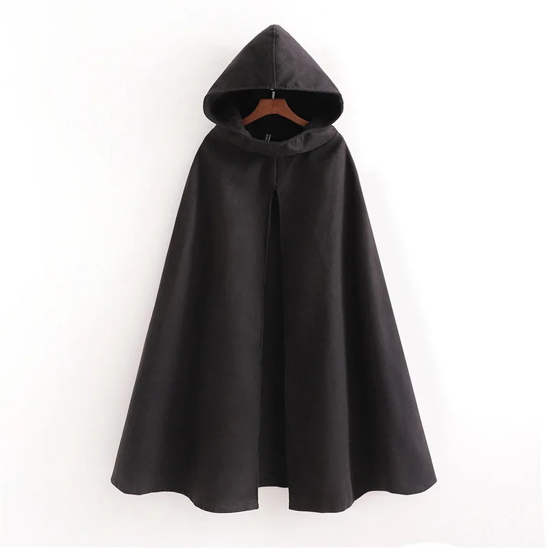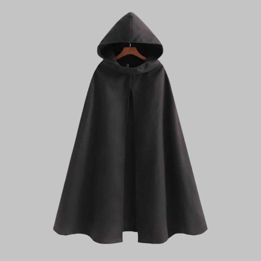 Cape mi-longue noire à capuche – Style sorcière pour femme