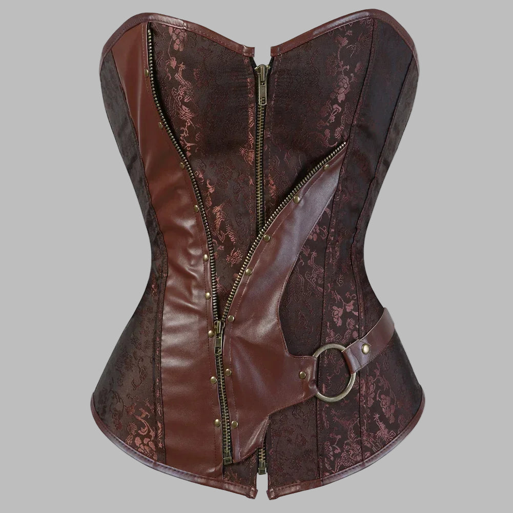 Corset steampunk marron en brocart avec fermeture éclair et ceinture à anneau