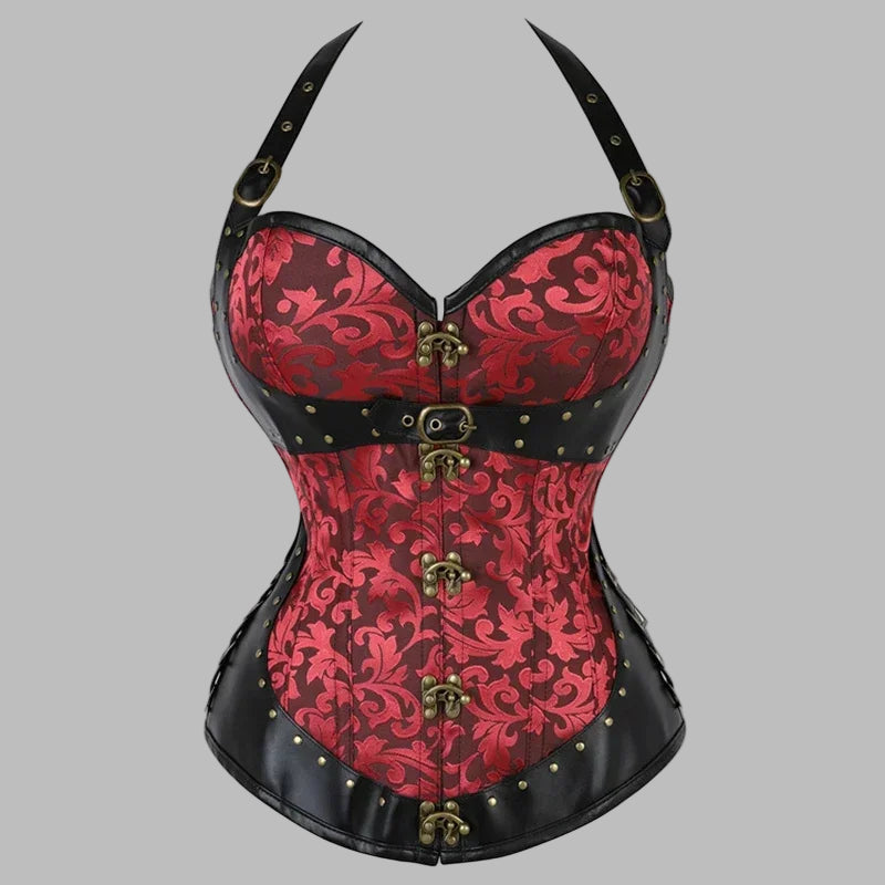 Corset Steampunk Rouge en Brocart avec Éléments en Cuir Noir et Boucles XXL
