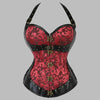 Corset Steampunk Rouge en Brocart avec Éléments en Cuir Noir et Boucles