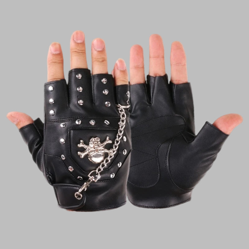 Gants Punk en Cuir Sans Doigts Clous Chaîne Crâne