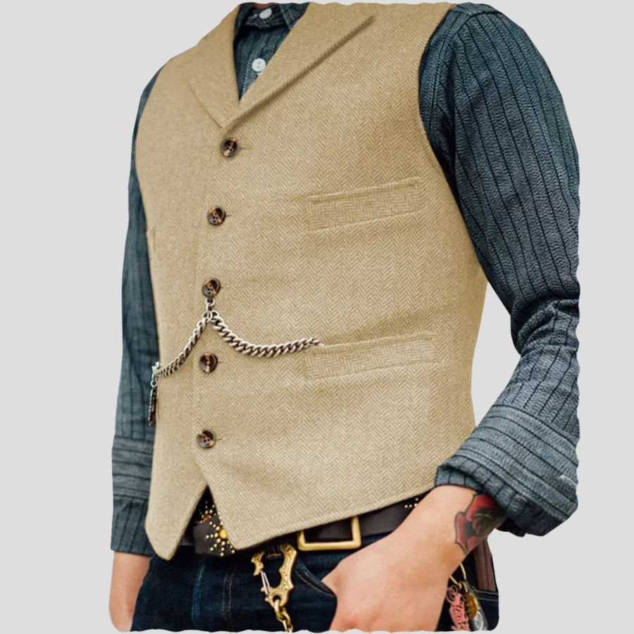 Gilet Steampunk Beige à Motif Chevron avec Chaîne de Poche