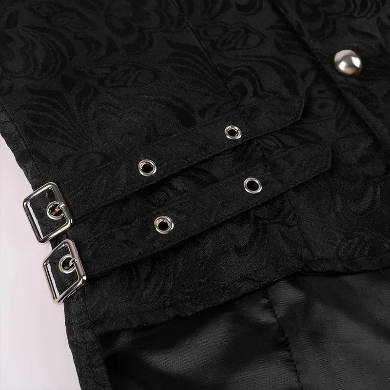 Gilet Steampunk Noir à Motif Brocart avec Plis