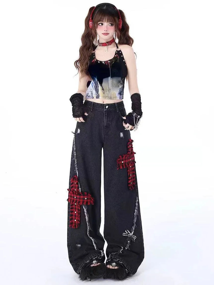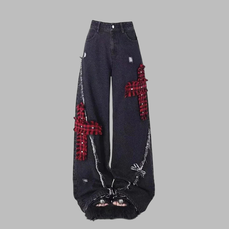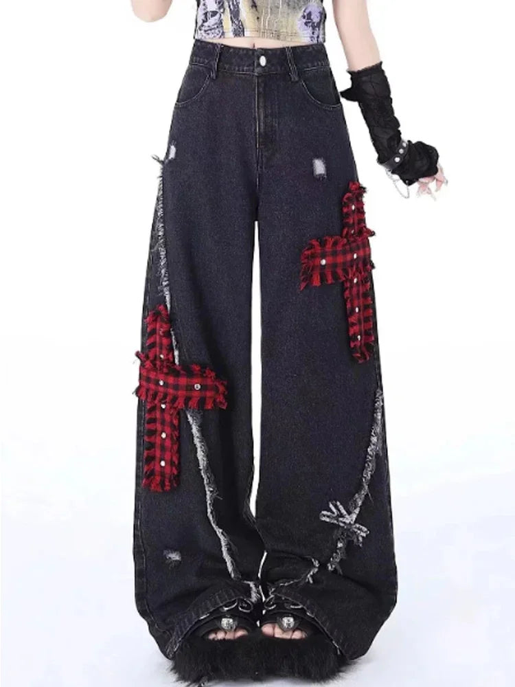Pantalon large en jean grunge à carreaux rouges avec déchirures