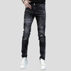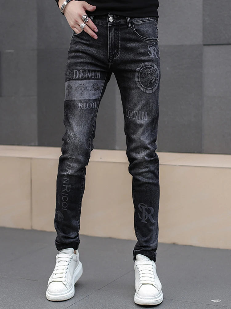 Jean Slim Noir Rock avec Inscriptions et Motifs Graphiques