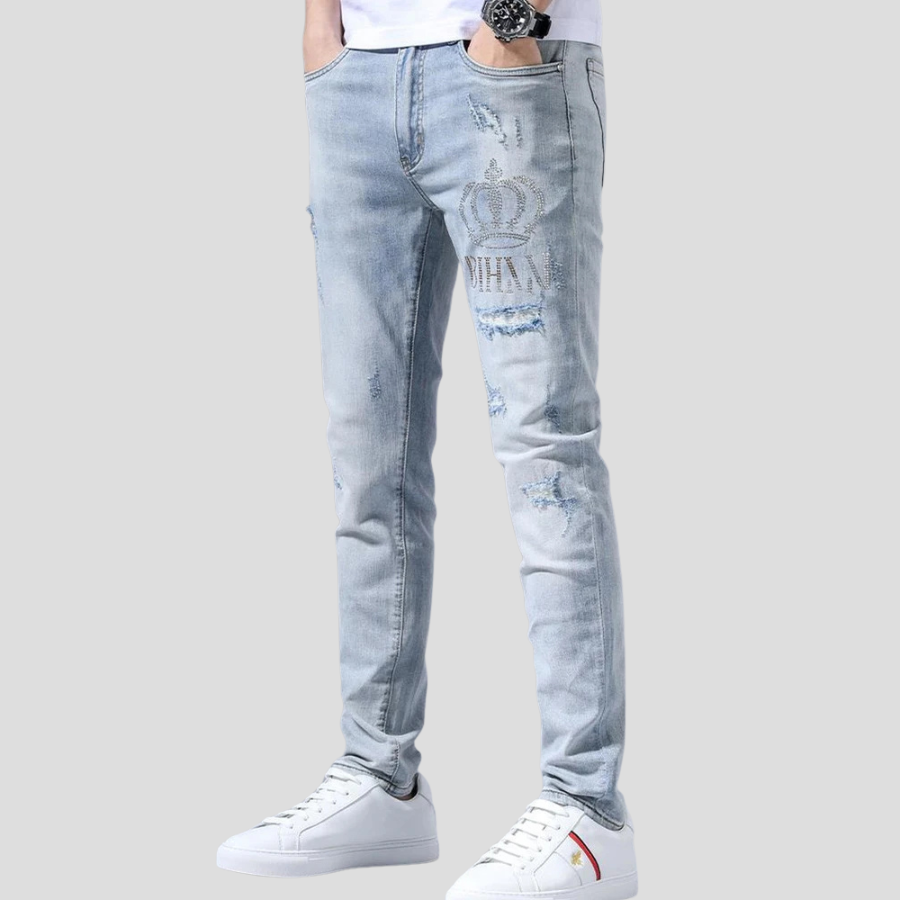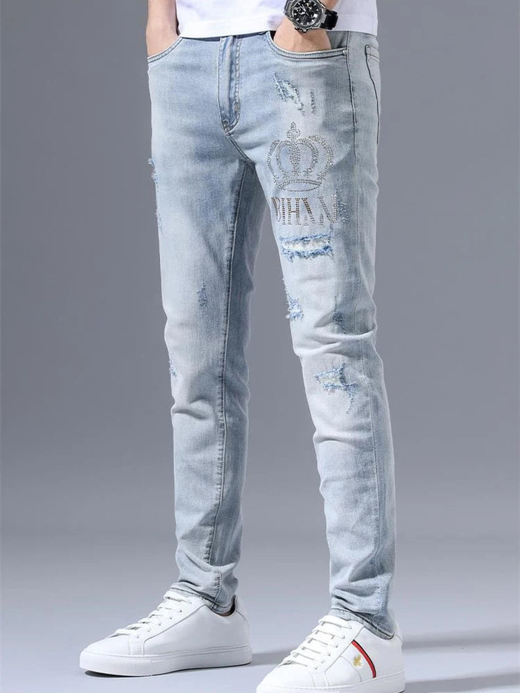 Jeans Rock avec Effets Usés et Couronne Bleu Clair