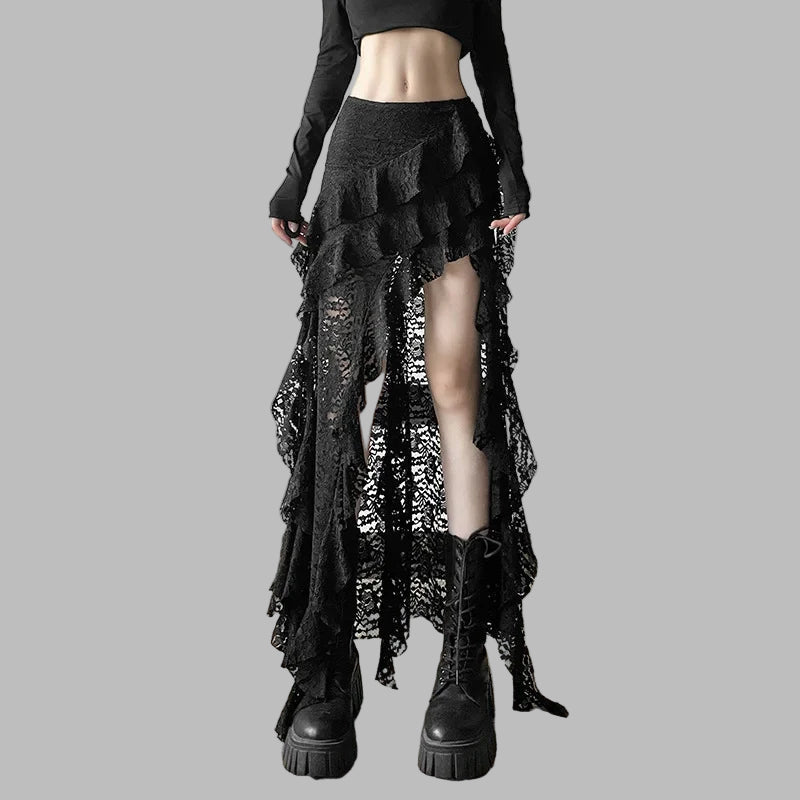 Jupe asymétrique gothique noire punk avec dentelle et franges