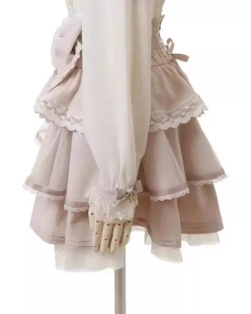 Jupe Beige Jirai Kei avec Nœud et Finition en Dentelle