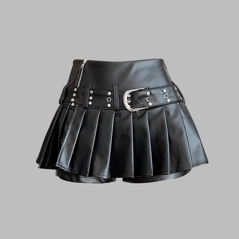 Jupe Mini Noire Plissée en Cuir avec Ceinture Métal