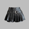 Jupe Mini Noire Plissée en Cuir avec Ceinture Métallique