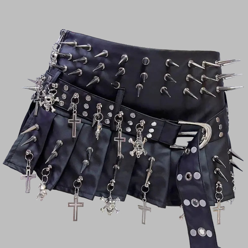 Jupe Plissée Métal avec Clous et Chaînes Noire