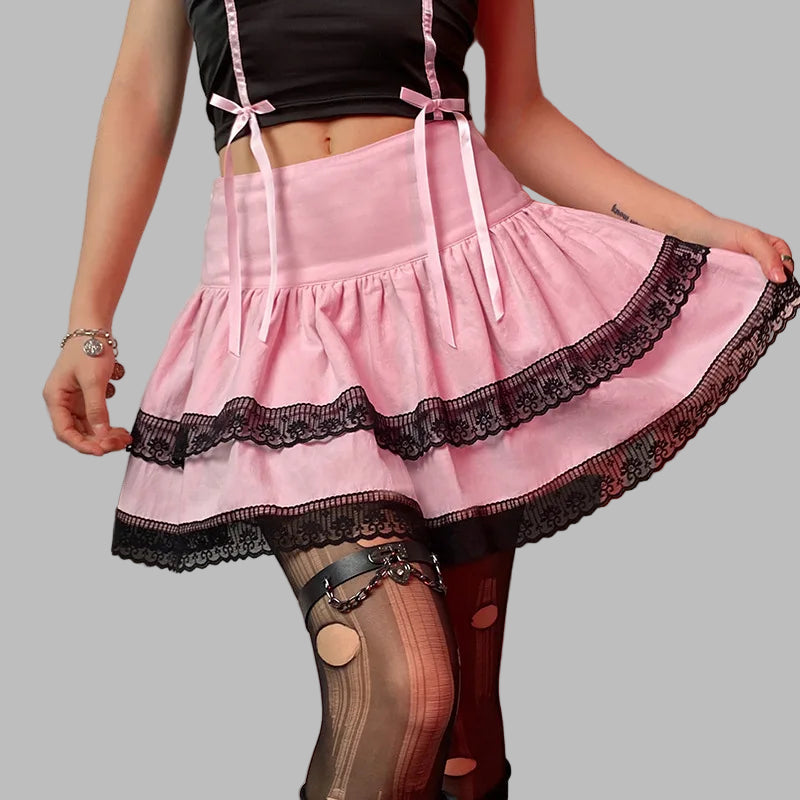 Jupe Punk Jirai Kei Rose avec Dentelle Noire et Volants