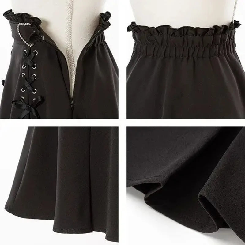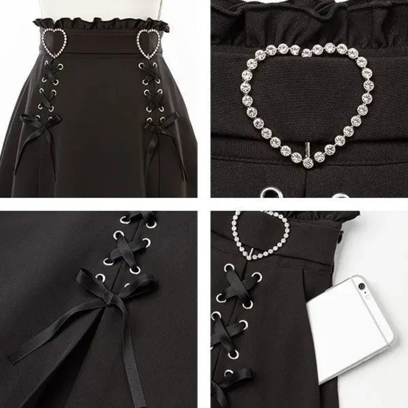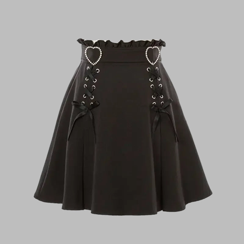Jupe Punk Noire à Double Laçage et Cœurs