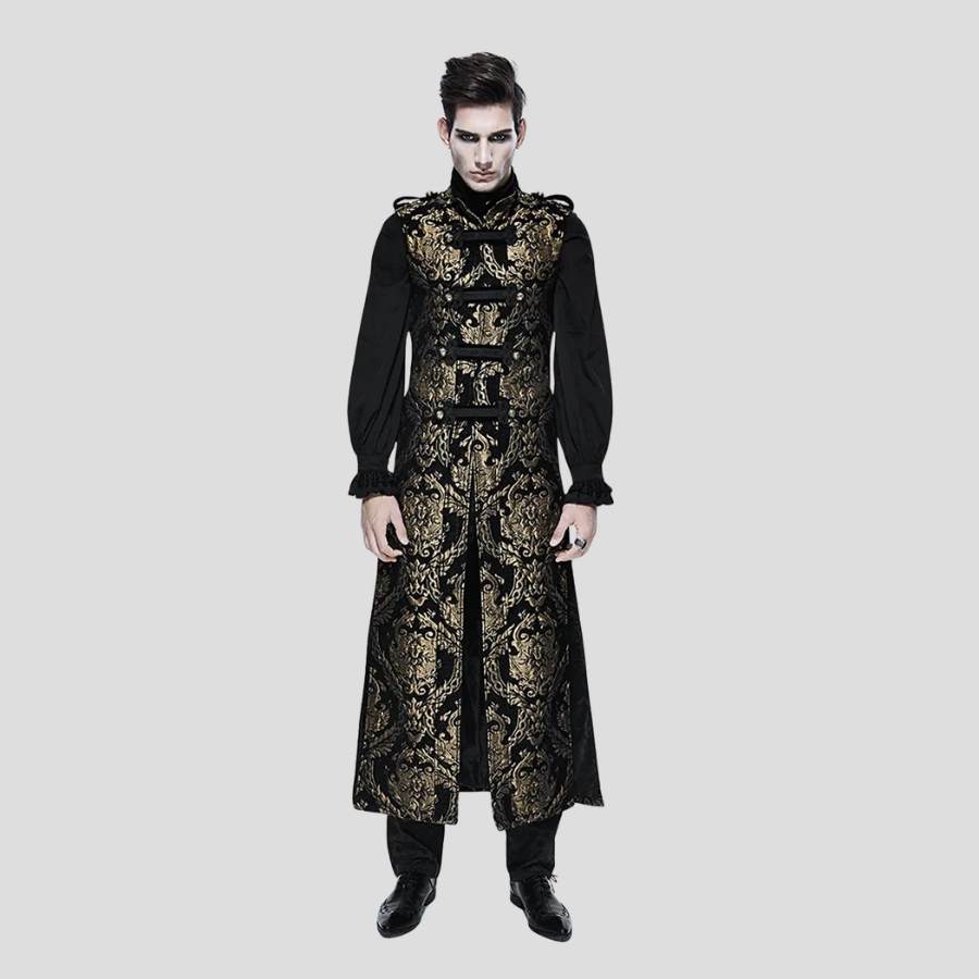 Manteau Long Steampunk Goth avec Motif Brocart et Ceintures