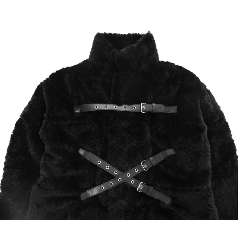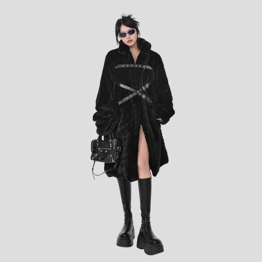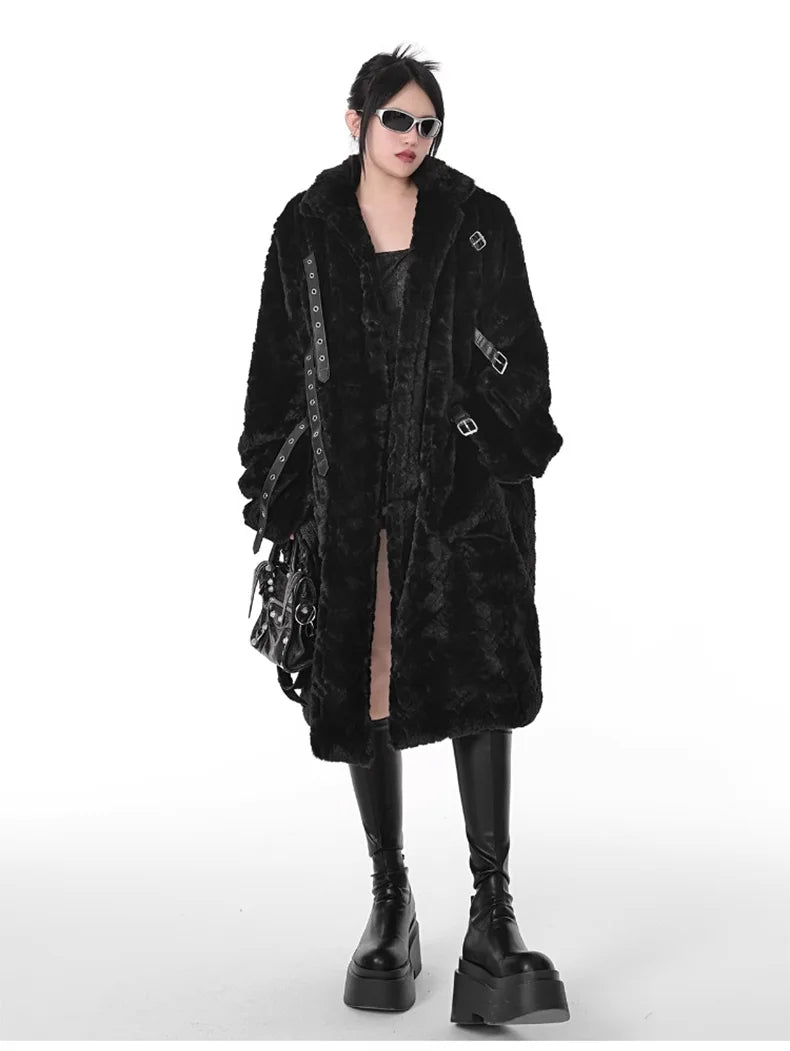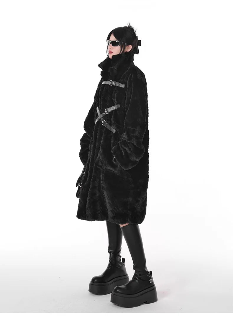 Manteau Punk Métal Noir à Ceintures Longue avec Fourrure