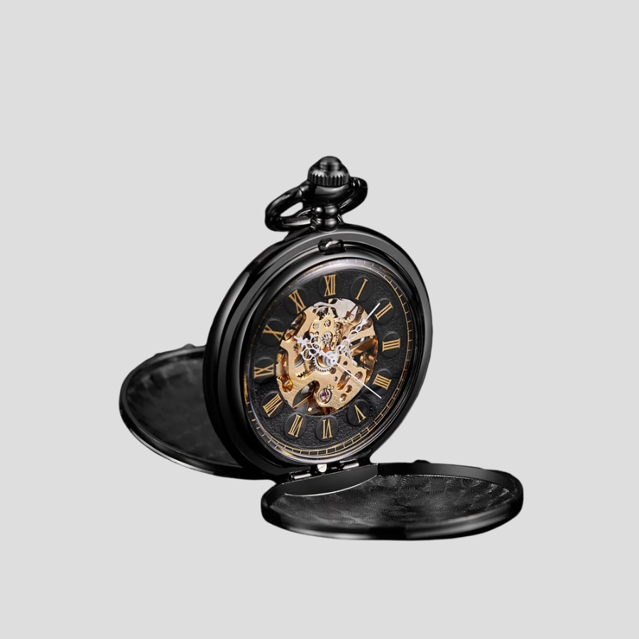 Montre de Poche Mécanique Steampunk Noire avec Détails Dorés