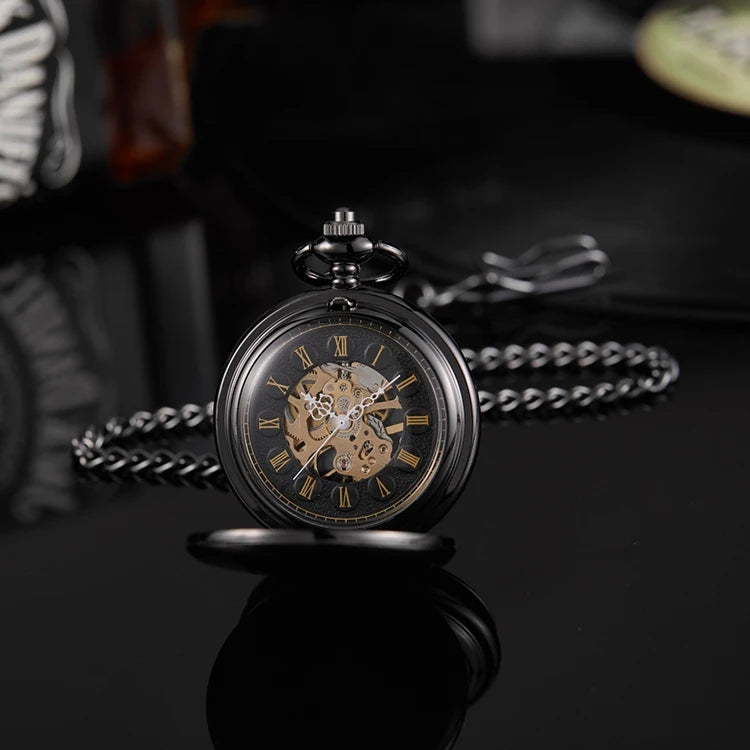 Montre de Poche Steampunk Mécanique Noire avec Détails Dorés