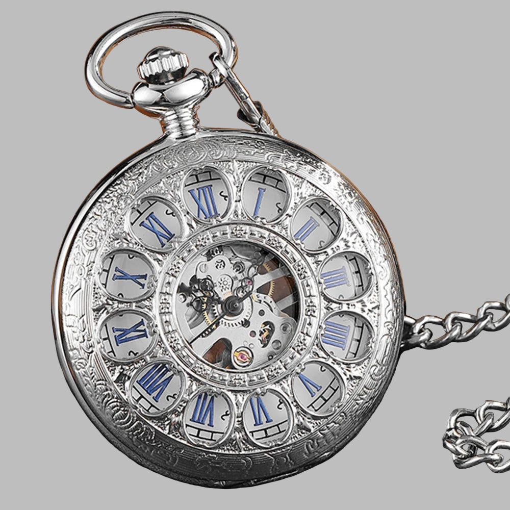 Montre de Poche Steampunk Argentée Mécanique avec Chaîne