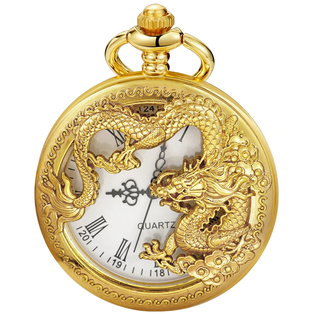 Złoty Zegarek Kieszonkowy Steampunk z Grawerem Smoka Quartz