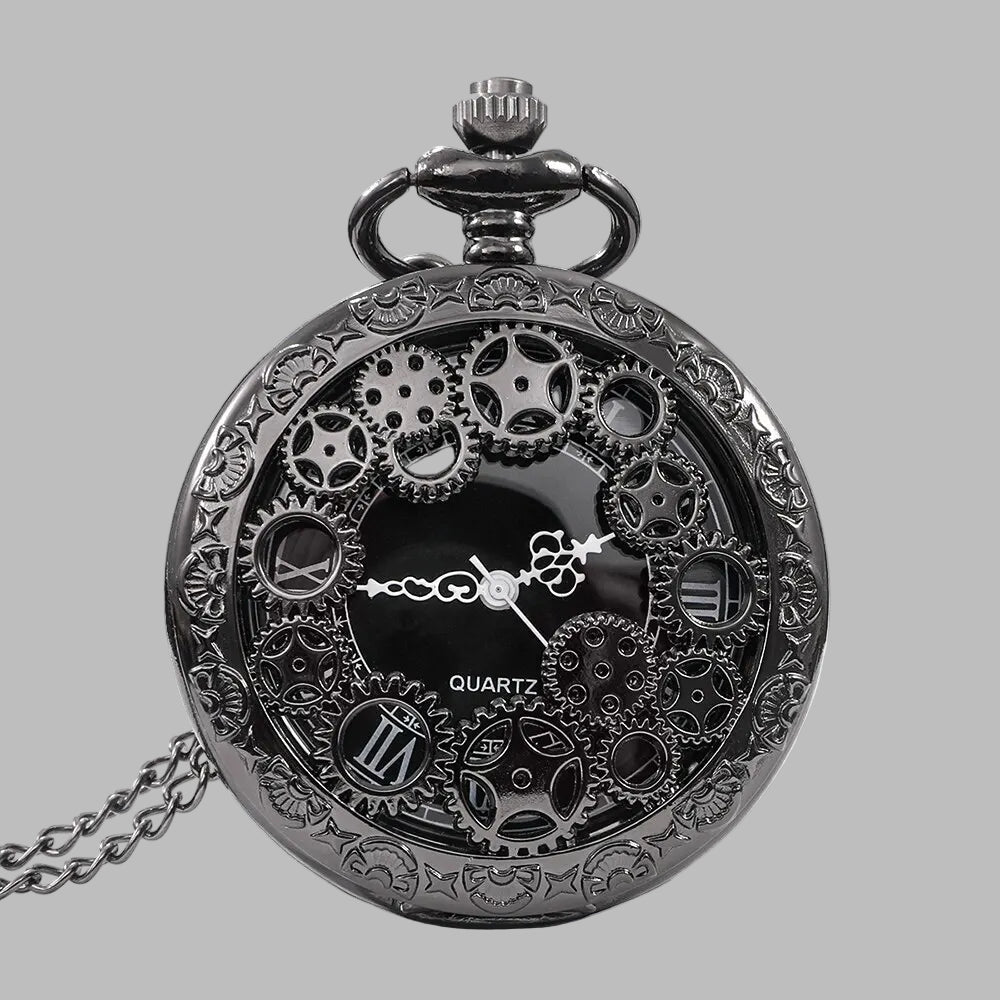 Montre de Poche Steampunk Noire avec Rouages Mécaniques