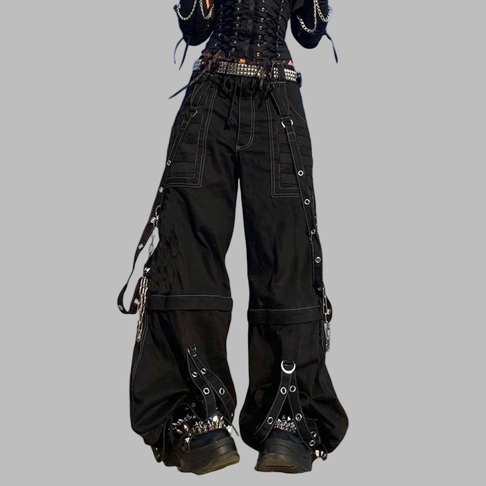 Pantalon Cargo Punk Métal Noir avec Chaînes et Clous Voir les options