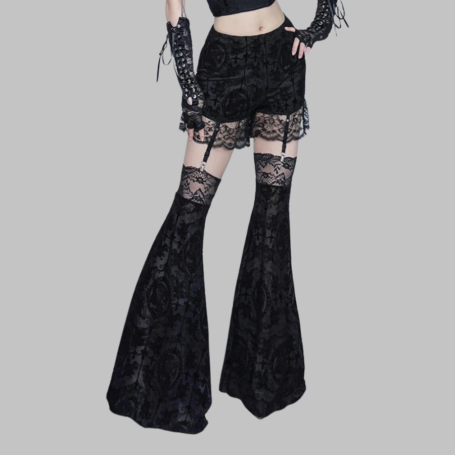 Pantalon gothique noir évasé en dentelle avec jupe courte