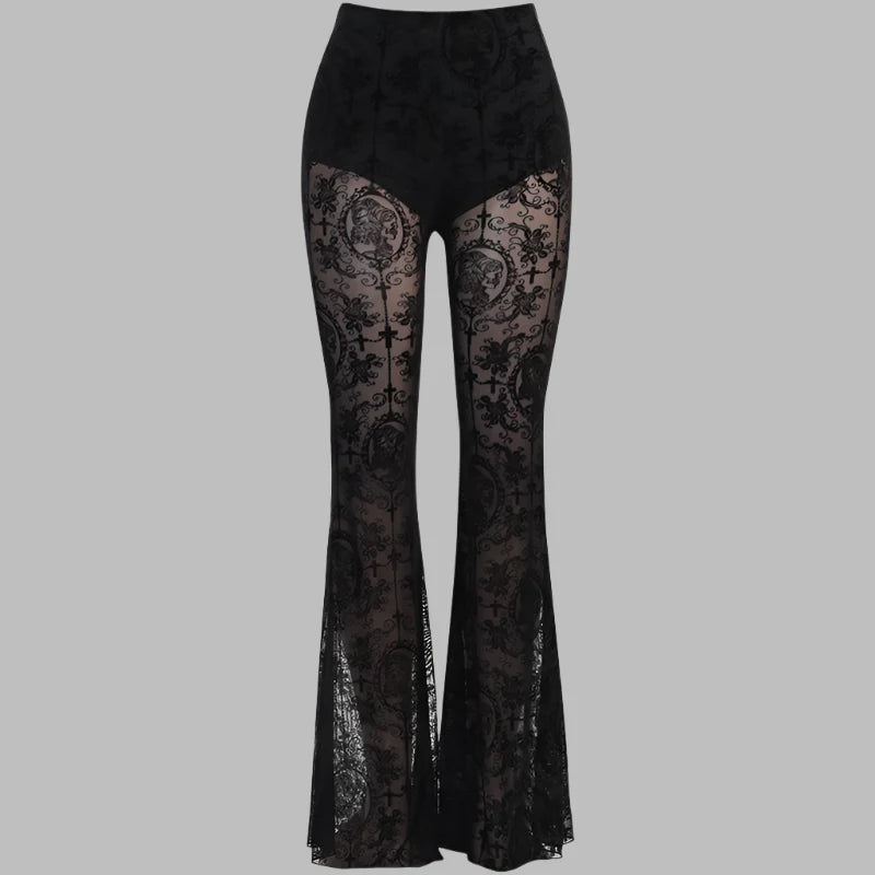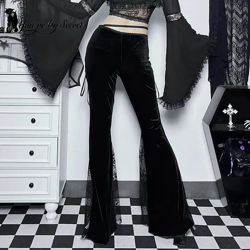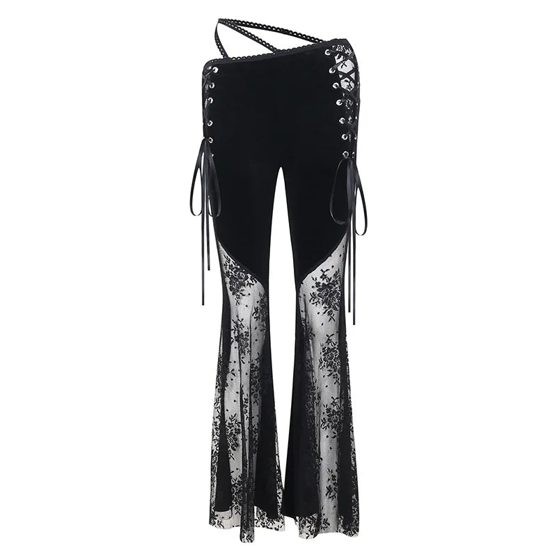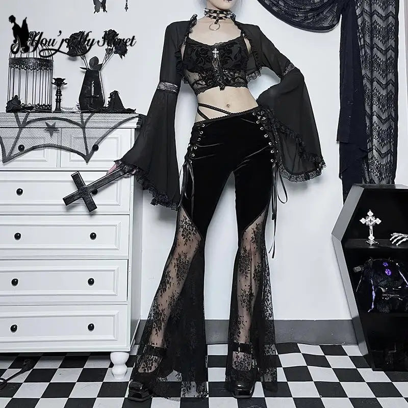 Pantalon gothique noir avec fentes et détails en dentelle 1