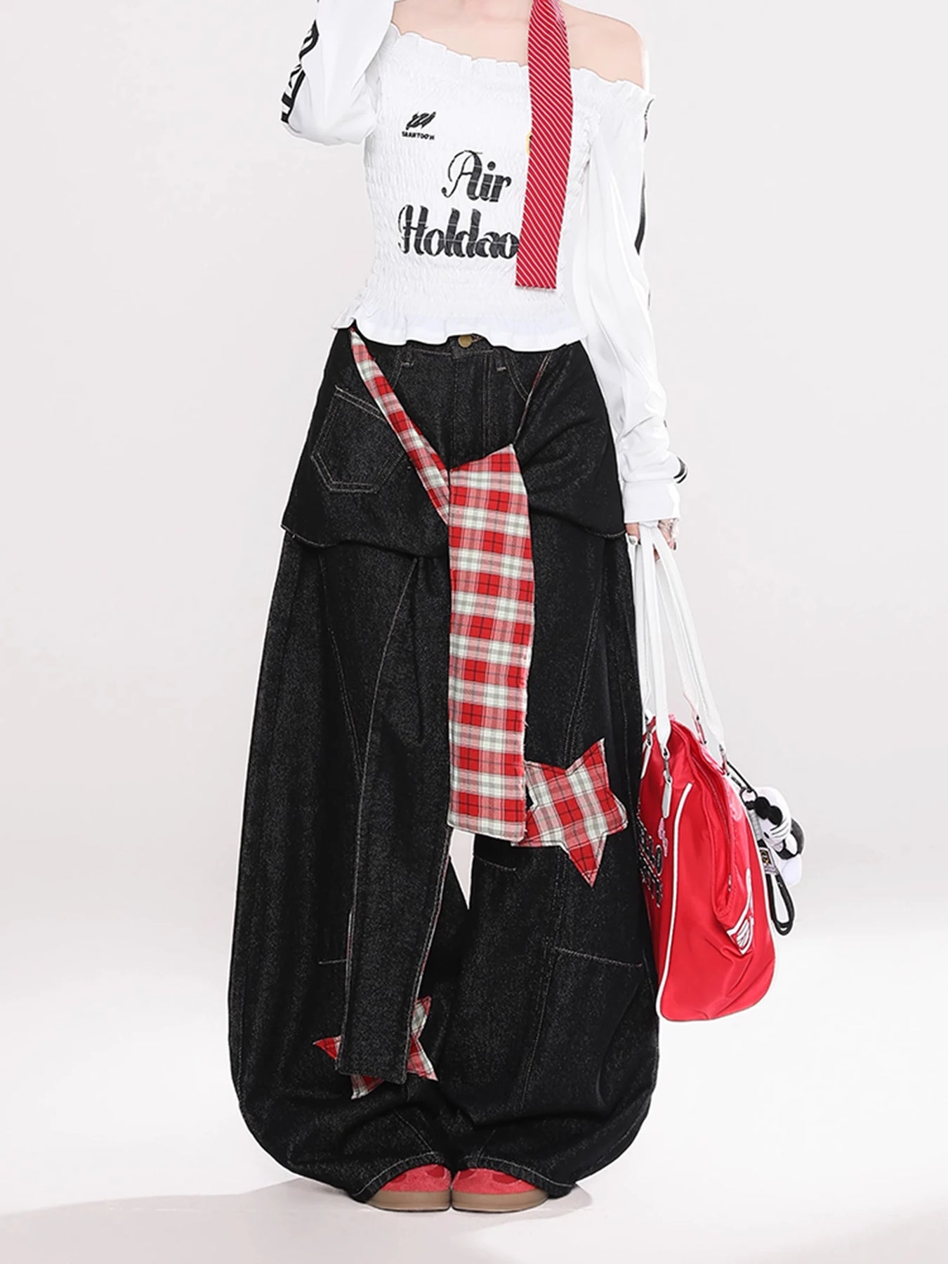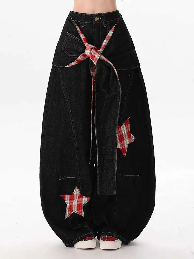 Pantalon Large Punk Noir Long avec Étoiles Femme Oversize