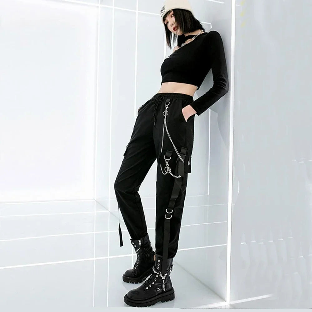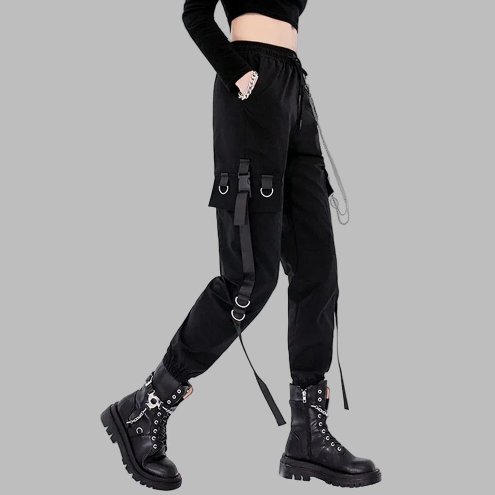 Pantalon Punk Noir avec Anneaux Métalliques et Sangles Tactiques