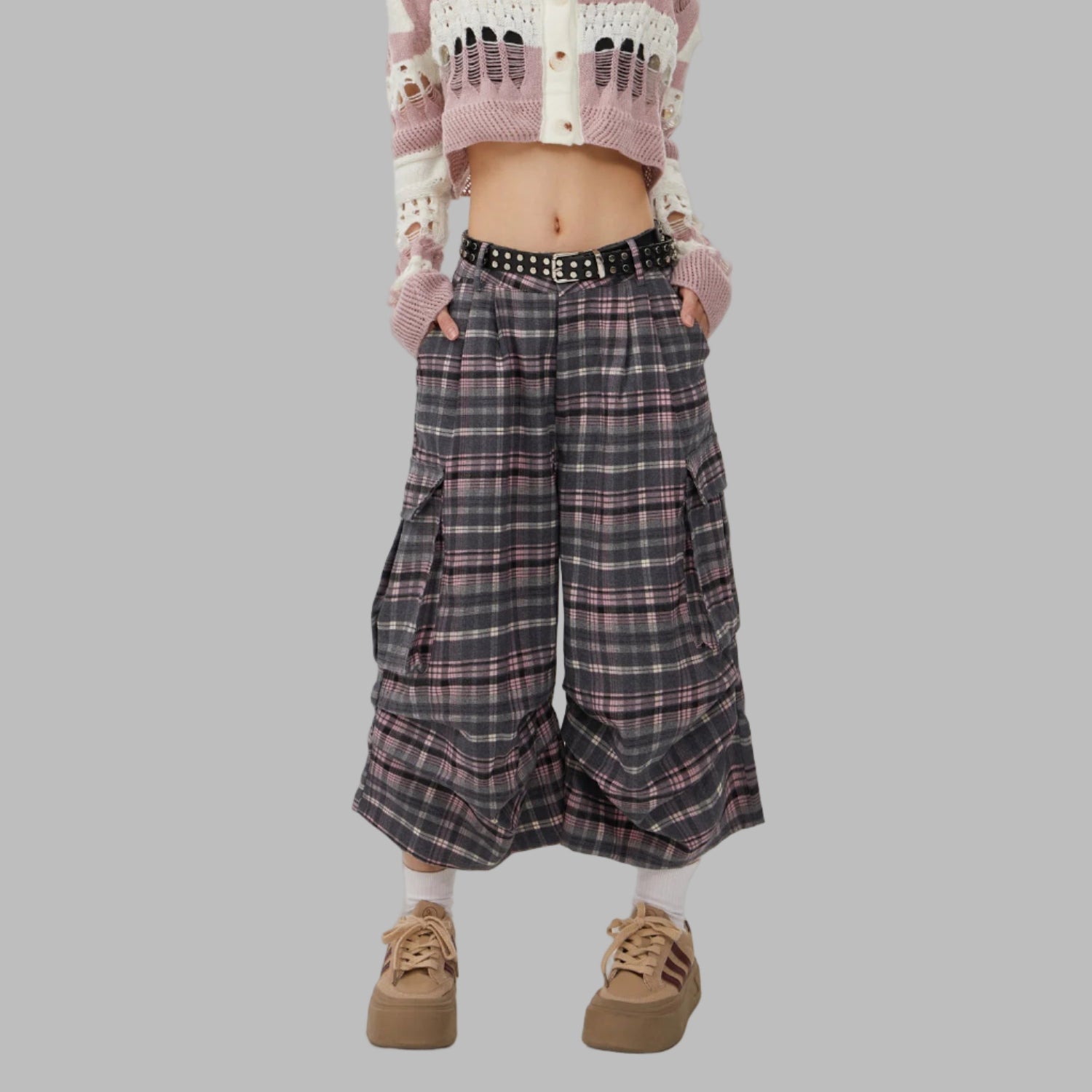 Pantalon Punk Rock à Carreaux avec Dentelle Gris et Rose