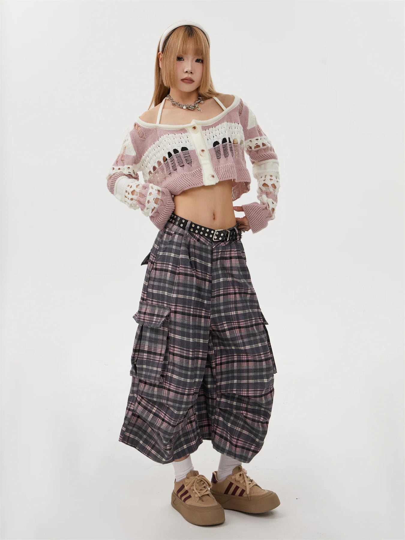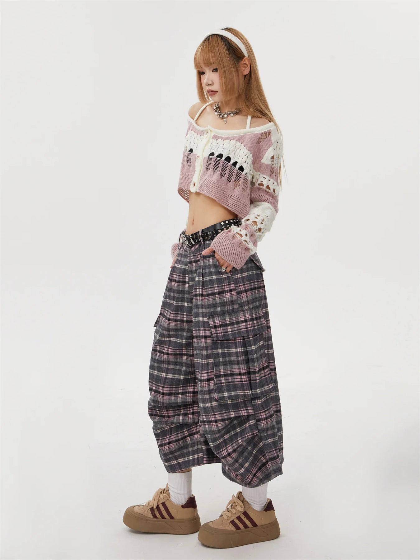 Pantalon Punk Rock à Carreaux avec Dentelle Gris-Rose Voir les options