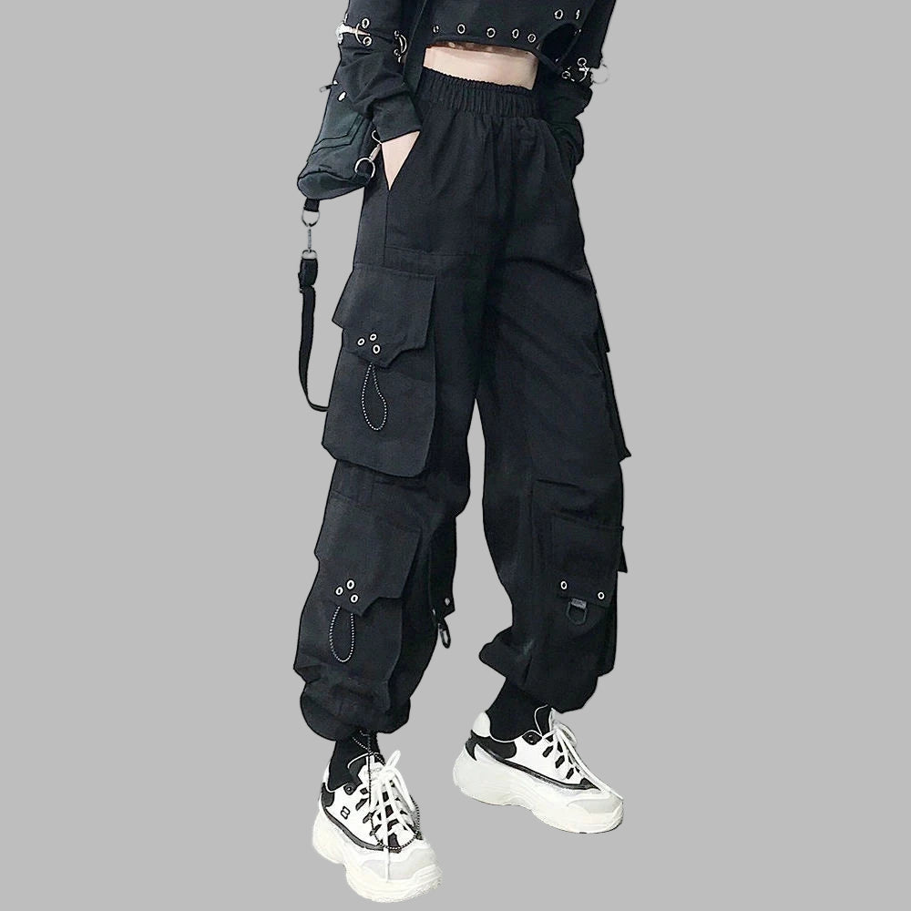 Pantalon Tactique Punk Noir avec Poches et Chaînes Grunge