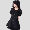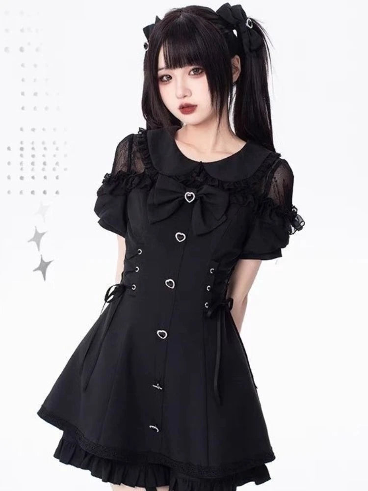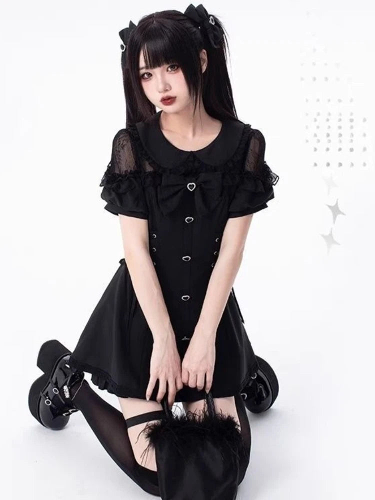 Robe Jirai Kei Noire à Volants avec Boutons en Forme de Cœur