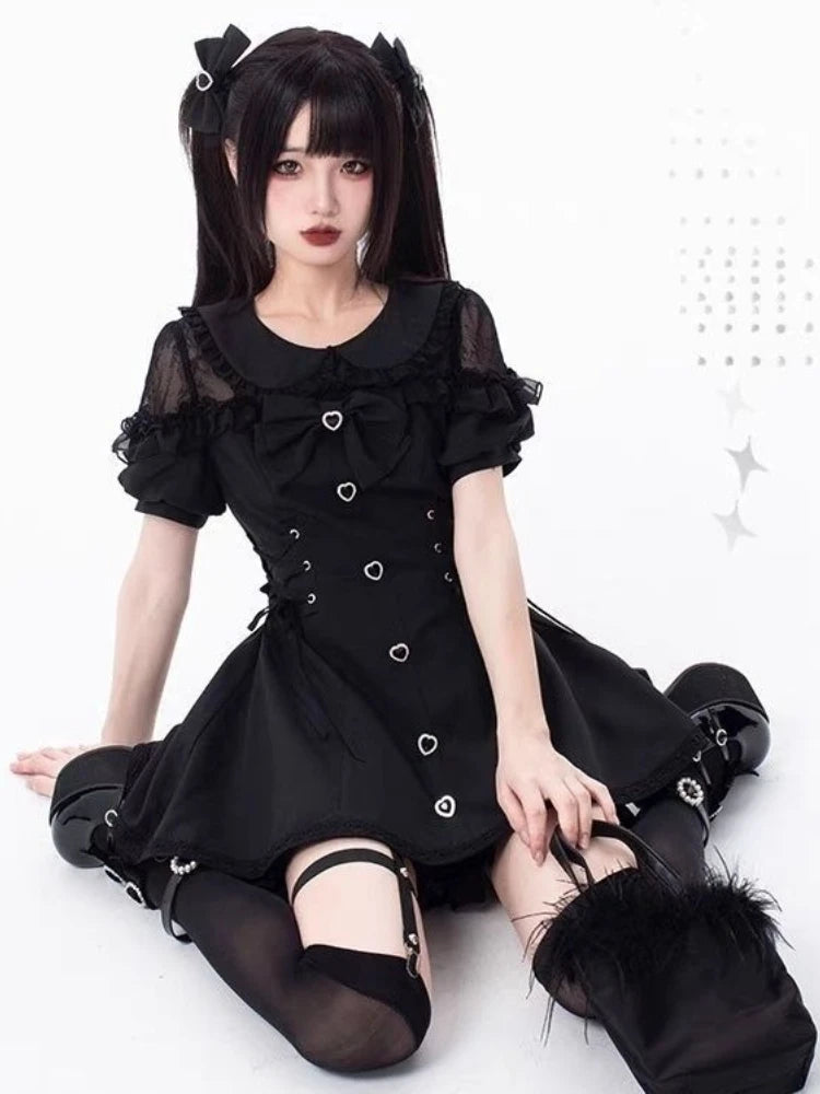 Robe Jirai Kei à Boutons en Forme de Cœur Noire à Volants