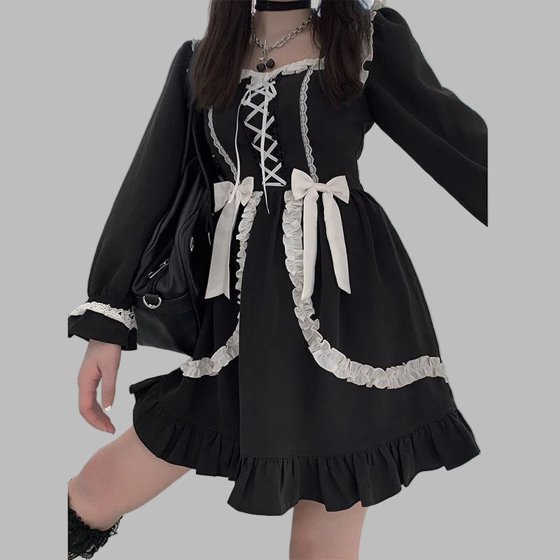 Robe Jirai Kei noire avec nœuds blancs et laçage