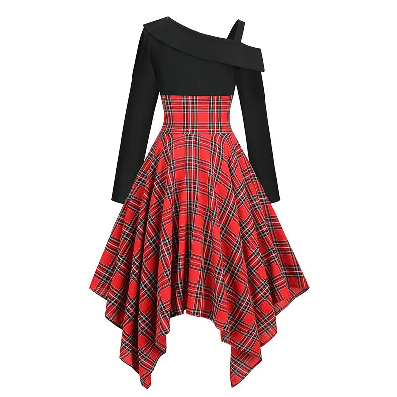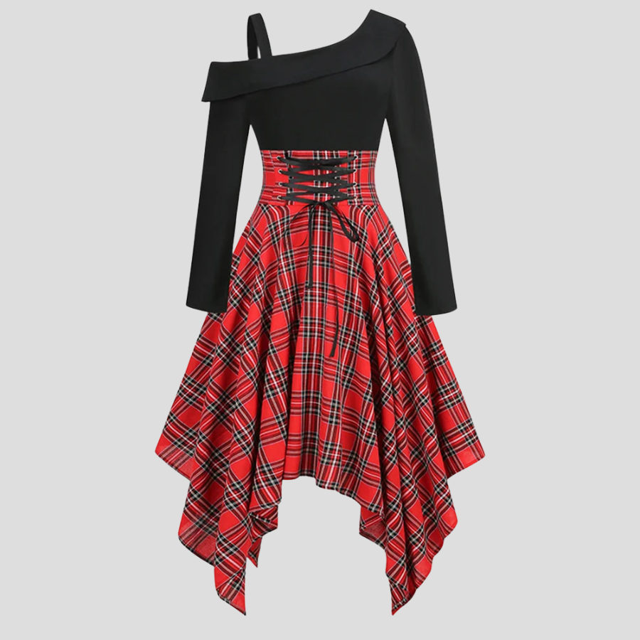 Robe Punk Rock Asymétrique à Carreaux Rouges avec Corset