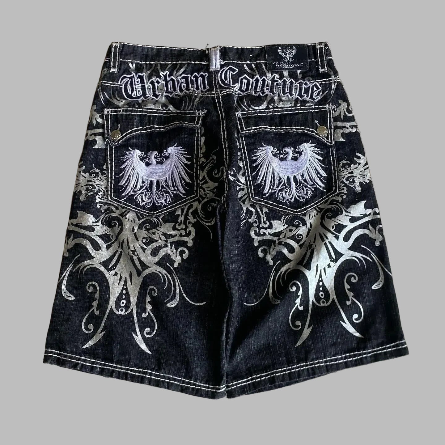 Short en Jean Grunge Métal avec Aigles et Motifs Tribaux