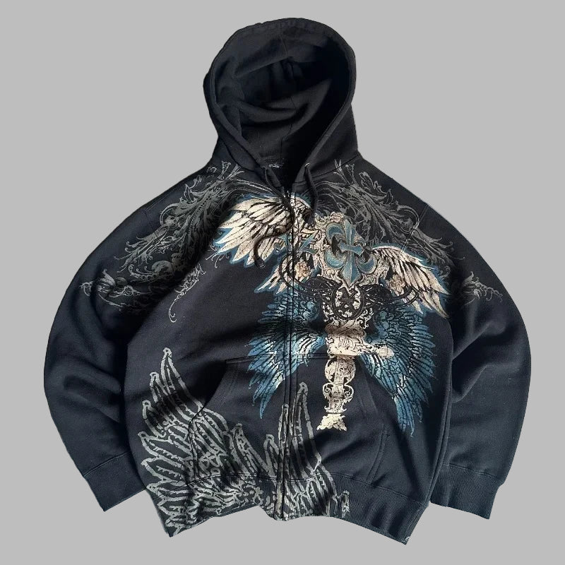 Sweat à Capuche Noire Métal avec Imprimé Ailes et Crânes Voir les options