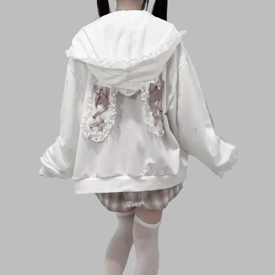 Sweatshirt Oversize Jirai Kei avec Nœuds en Dentelle Blanc