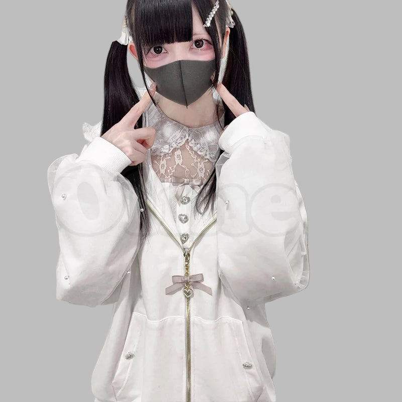 Sweat Oversize Jirai Kei avec Nœuds en Dentelle Blanc