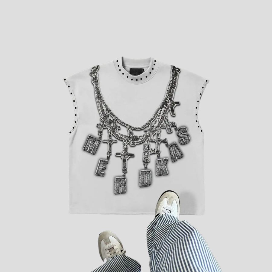 T-shirt Blanc Punk avec Graphisme Chaînes Métal