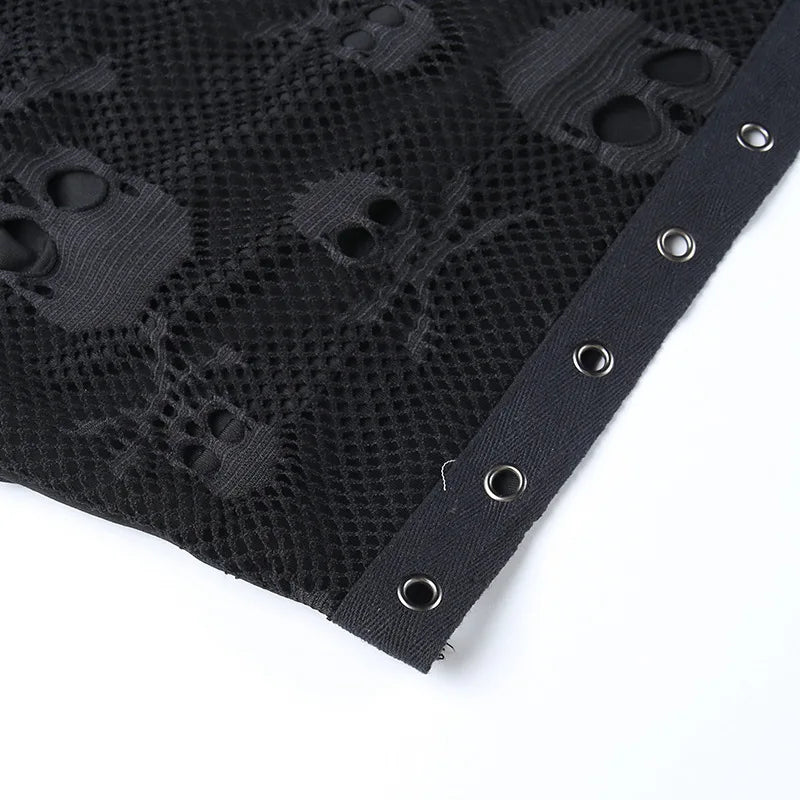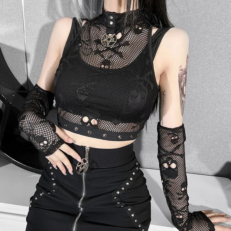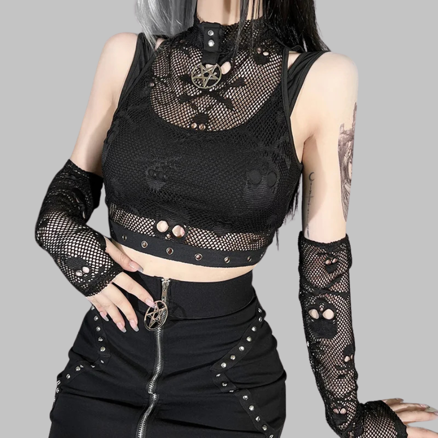Top gothique noir en résille avec imprimé crâne et manches filet