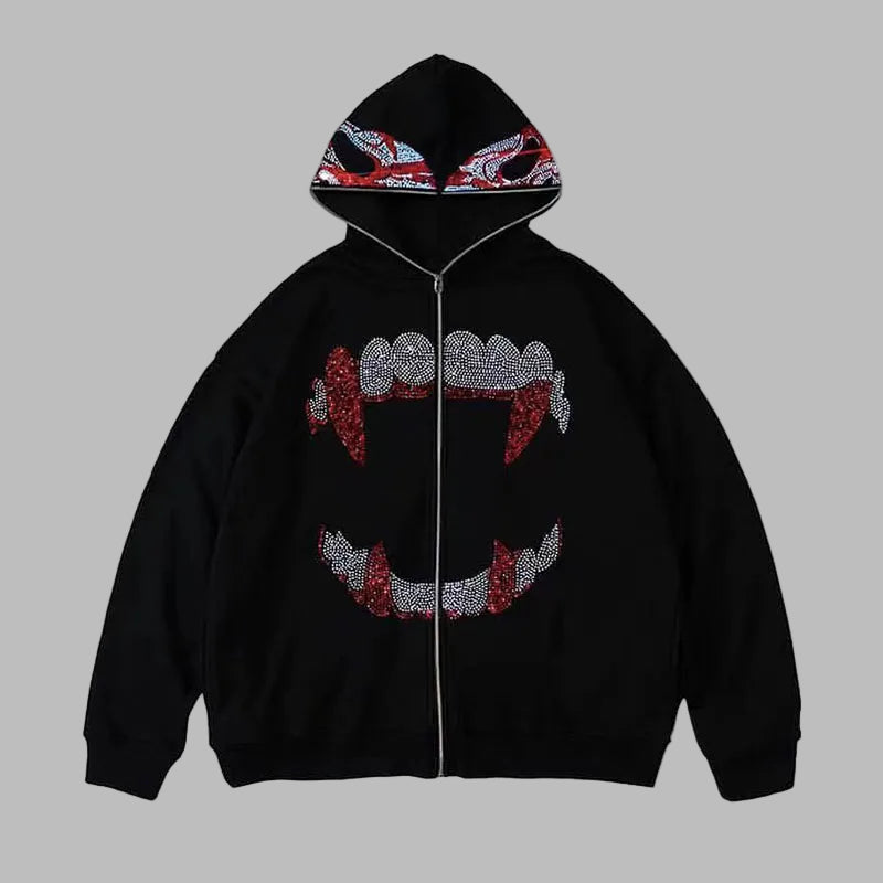 Sweat à Capuche Zippé Noir Gothique Femme avec Crocs de Vampire