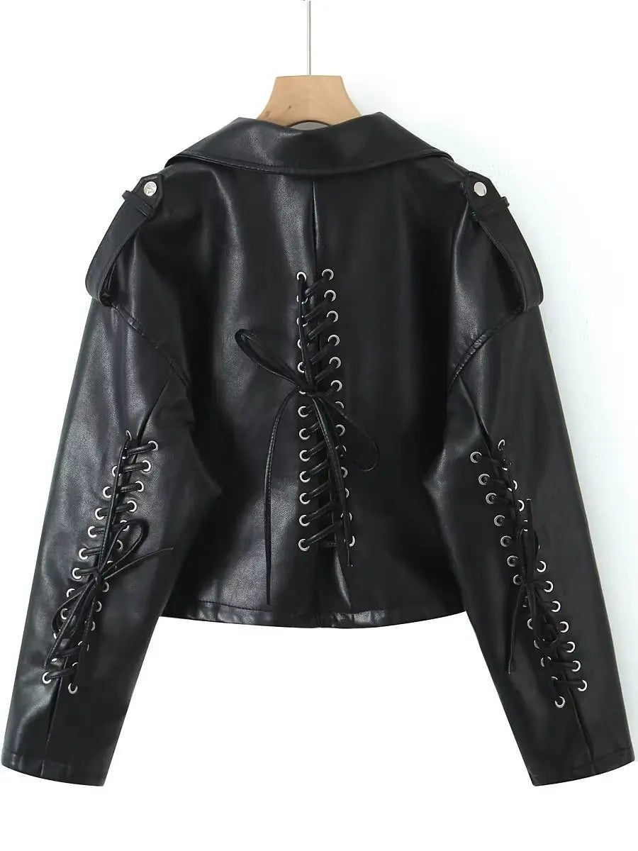 Veste en Cuir Noire avec Lacets Gothique Metal