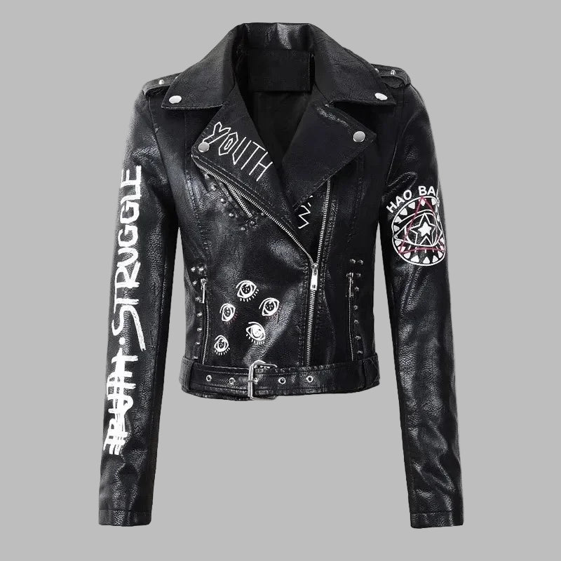Veste Femme Punk Goth en Cuir Noir avec Clous et Écritures Grunge Retry