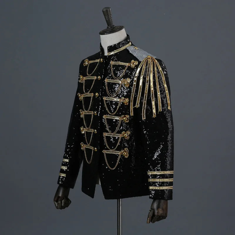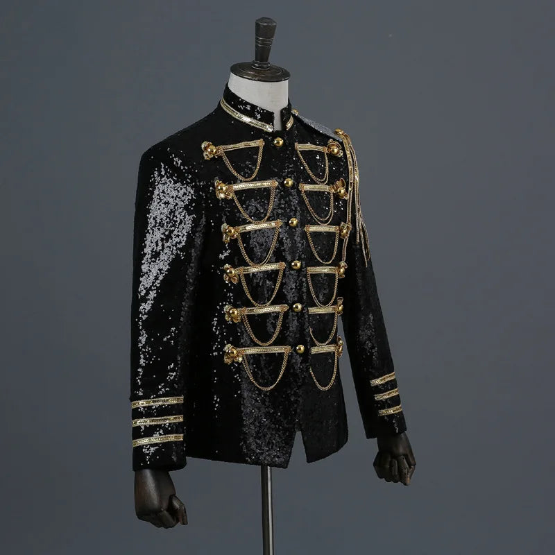 Veste en métal noire à paillettes avec chaînes et détails dorés
