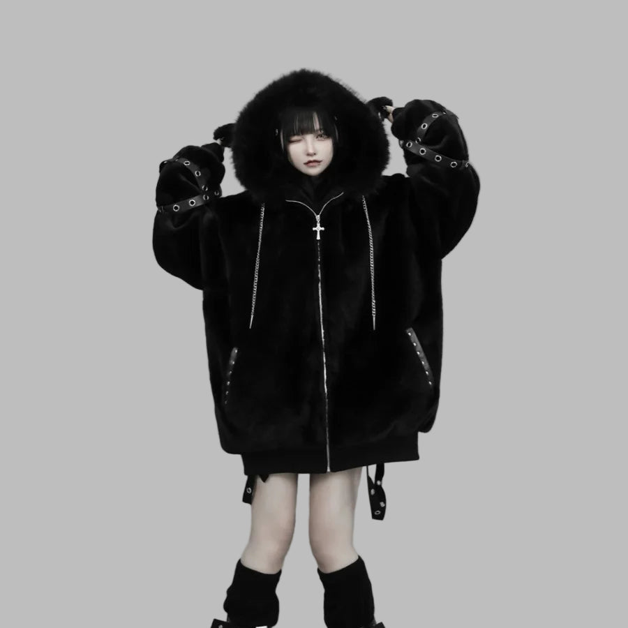 Veste Goth Punk Métal Noire avec Croix et Fourrure