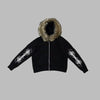 Veste Punk Noire avec Capuche en Fourrure et Motifs Métal